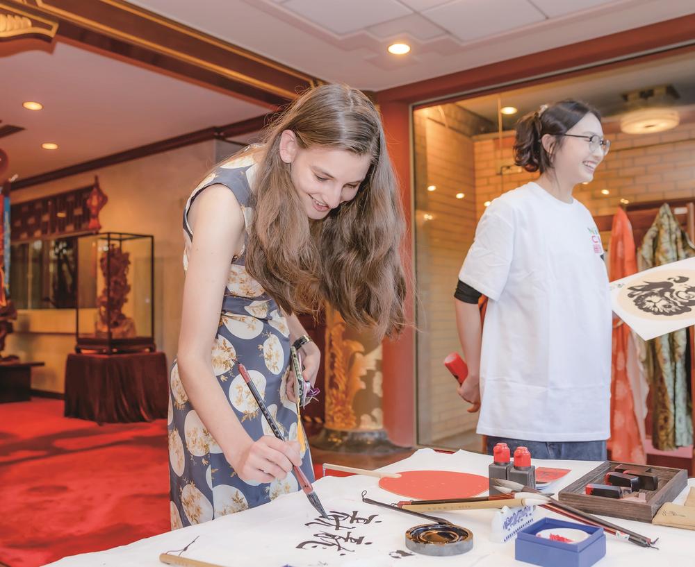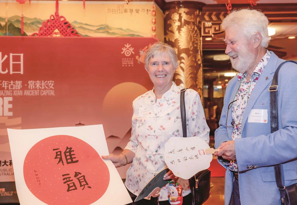 སྤྱི་ཟླ2པའི་ཚེས27ཉིན་ལ། ཨོ་སི་ཁྲུ་ལི་ཡའི་ཁན་པེ་རར་བཅའ་སྡོད་བྱེད་པའི་ཀྲུང་གོའི་གཞུང་ཚབ་ཁང་དུ་སྐུ་མགྲོན་ཚོས་ཀྲུང་གོའི་ཡིག་གཟུགས་སྒྱུ་རྩལ་ལ་མྱོང་རོལ་བྱེད་བཞིན་པ།