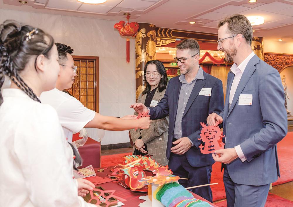 སྤྱི་ཟླ2པའི་ཚེས27ཉིན་ལ། ཨོ་སི་ཁྲུ་ལི་ཡའི་ཁན་པེ་རར་བཅའ་སྡོད་བྱེད་པའི་ཀྲུང་གོའི་གཞུང་ཚབ་ཁང་དུ་སྐུ་མགྲོན་ཚོས་ཀྲུང་གོའི་ཤོག་དྲས་སྒྱུ་རྩལ་ལ་མྱོང་རོལ་བྱེད་བཞིན་པ།