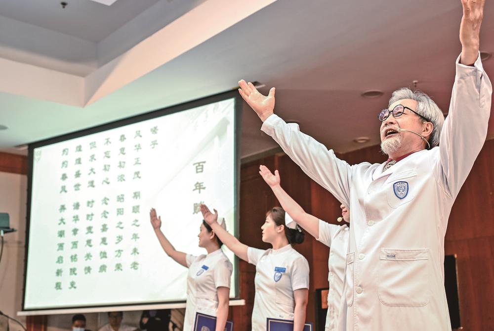 སྨན་ཞབས་པ་རྒན་གྲས་ཆུས་ཝེ་ཞང་གིས་གཞོན་ནུ་ཚོར་གཏམ་བཤད་བྱེད་བཞིན་པ།