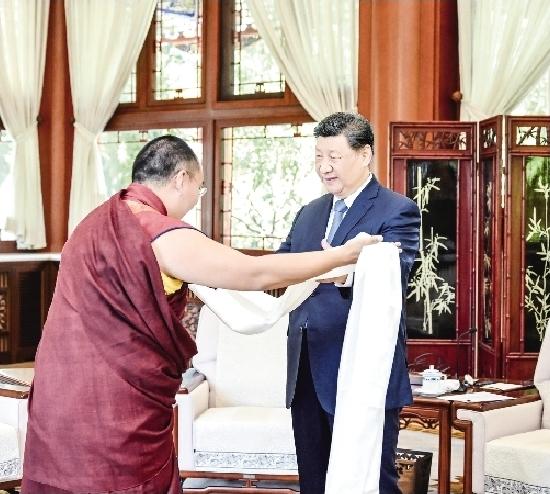 པཎ་ཆེན་རིན་པོ་ཆེས་ཞི་ཅིན་ཕིང་ལ་མཇལ་དར་ཕུལ་བ་དང་འབྲེལ་ཉེ་བའི་ལོ་ཤས་རིང་རང་ཉིད་ཀྱི་སློབ་གཉེར་དང་ལས་ཀའི་གནས་ཚུལ་སྙན་སེང་ཞུས་པ་རེད། ཞི་ཅིན་ཕིང་གིས་ཁོང་ལ་ཕྱོགས་གང་ས་ཅི་ཐད་ལ་གྲུབ་འབྲས་ཡག་པོ་ཐོབ་པར་བཀྲ་ཤིས་བདེ་ལེགས་ཞུས་གནང་བ་རེད།
