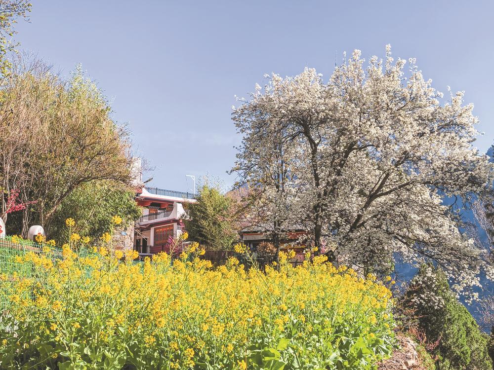 ཉེ་ཆར། གནམ་གཤིས་ཇེ་དྲོར་སོང་བ་དང་བསྟུན་ནས་ཁམ་བུ་མེ་ཏོག་དང་ལི་མེ་ཏོག་གི་མཛེས་སྡུག་རེ་རེས་རོང་བྲག་གི་རི་ལུང་ཐམས་ཅད་ན་དཔྱིད་དཔལ་གྱི་འཆོར་སྒེག་མངོན་བཞིན། ཡུལ་ལུང་ཀུན་གྱི་སྐྱེ་དངོས་མཐའ་དག་ལ་ཚེ་སྲོག་གི་འཚོ་བཅུད་གསར་པ་བསྣན་པས་གསོན་ཉམས་འཕེལ་ཞིང་ཚོན་མདངས་རྣམ་པར་བཀྲ་བའི་མཛེས་རིས་ཤིག་ཏུ་གྲུབ། རི་བོ་དང་ཆུ་མོས་སྔོ་ལྗང་གི་གོས་བཟང་བཀླུབས་པ་དང་། མེ་ཏོག་ཁྲ་ཚོམ་གྱི་གསེང་དུ་ལྷོད་འབོལ་ལེར་གནས་པའི་གནའ་བོའི་མཁར་རྫོང་དང་བོད་གྲོང་ནས་ཞི་འཇམ་བག་ཕེབས་ཀྱི་ཉམས་སྣང་ཞིག་གིས་ཀུན་ནས་ཁེངས་ཤིང་། ལོ་འཁོར་གཅིག་གི་ཆེས་མཛེས་སྡུག་ལྡན་པའི་དུས་ཚིགས་སུ་གྱུར། དེ་ལྟར་ཕྱོགས་བཞི་མཚམས་བརྒྱད་ནས་ཡོང་བའི་ཡུལ་སྐོར་བ་མང་པོའི་ཡིད་དབང་བཀུག་ཅིང་། མེ་ཏོག་གི་མཛེས་སྡུག་དང་རིག་གནས་ཡུལ་སྐོར་མཉམ་འདྲེས་ཀྱིས་ཡུལ་སྡེ་དར་རྒྱས་ལ་དབྱར་མཚོ་རྒྱས་བཞིན་གསོན་ཤུགས་བསྣན་པ་རེད།། ( བདེ་ཆེན་གྱིས་བྲིས།)