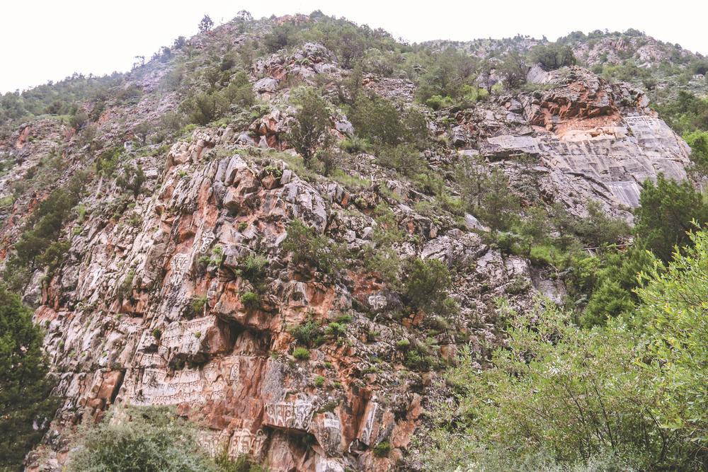 ཡུལ་ཤུལ་ཁུལ་སྐྱེ་རྒུ་གྲོང་རྡལ་ནས་སྤྱི་ལེ་ཉི་ཤུ་ཙམ་རྒྱང་བའི་ལེབ་ཁོག་ཅེས་པའི་ལུང་པ་ཞིག་གི་རི་ངོས་དང་བྲག་ངོས། དེ་བཞིན་ལམ་འགྲམ་གྱི་ཕ་བོང་ཡོངས་ལ་མ་ཎི་འབྲུ་དྲུག་དང་ཆོས་ཡིག་སོགས་རྡོ་ལ་བརྐོས་ཡོད་པས། ས་གནས་དེ་གའི་ཡུལ་མི་རྣམས་ཀྱིས་རི་བྱོན་མ་ཎི་ཞེས་མིང་ལའང་དེ་ལྟར་བརྗོད་བཞིན་འདུག། དེ་ནི་གནའ་སྔ་མོར་རྒྱ་བཟའ་ཀོང་ཇོ་བོད་དུ་བྱོན་དུས་ལུང་པ་འདི་ནས་ཕེབས་མྱོང་བ་དང་། ཕྱིས་སུ་ཕྱི་རབས་པ་རྣམས་ཀྱིས་ཀོང་ཇོ་བོད་དུ་ཕེབས་པར་རྗེས་དྲན་ཞུ་ཕྱིར་ལུང་གཞུང་འདིའི་རི་ཆུ་བྲག་གསུམ་གྱི་རྡོའི་ངོས་སུ་ལྷ་སྐུ་དང་མ་ཎི། བཀྲ་ཤིས་སྨོན་འདུན་སོགས་བརྐོས་པ་དང་།རྡོ་བརྐོས་འདི་དག་ལ་ལོ་ངོ་ཆིག་སྟོང་ལྷག་གི་ལོ་རྒྱུས་ཡོད་ཅེས་ད་ལྟ་མངོན་སུམ་དུ་མཇལ་རྒྱུ་འདུག།