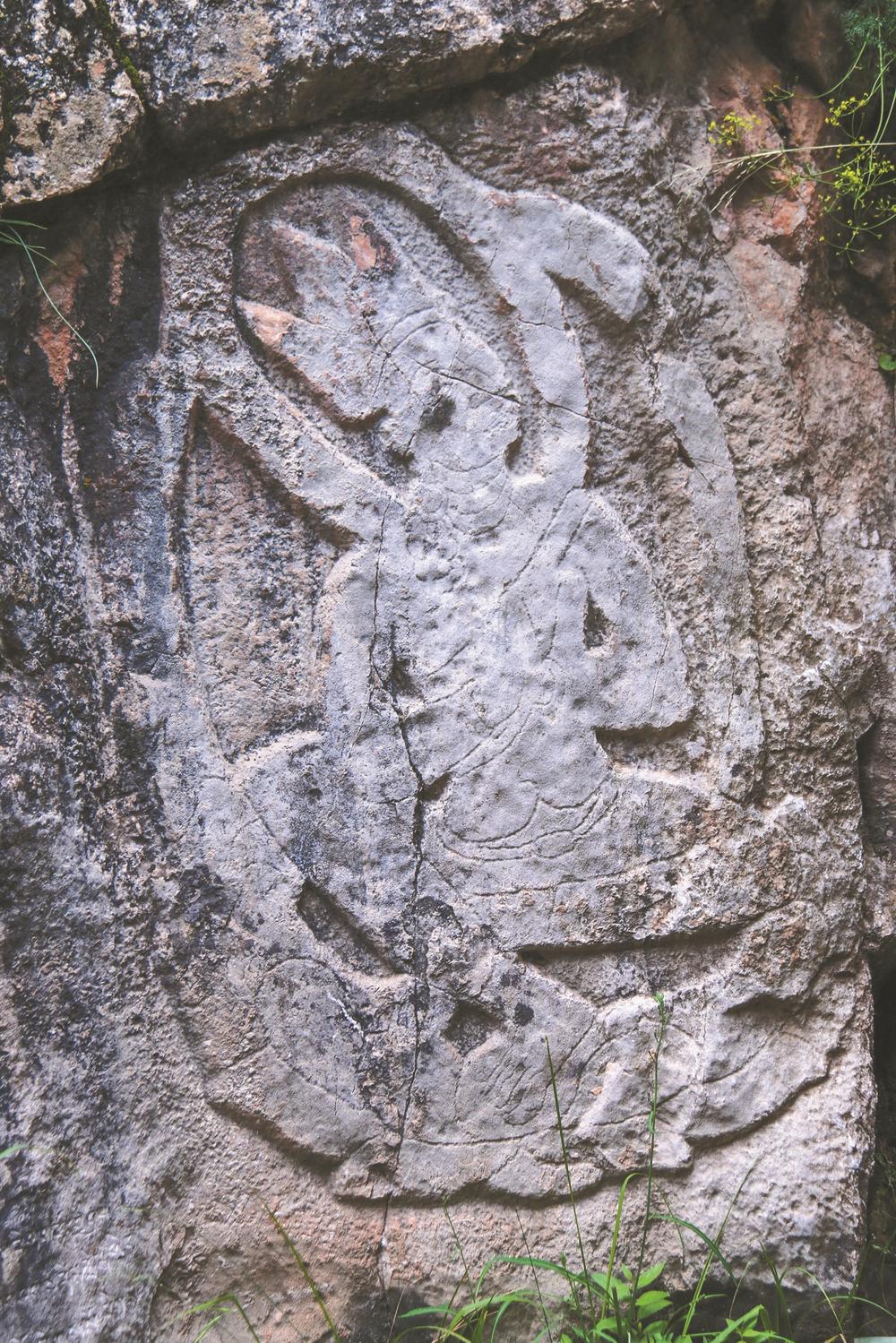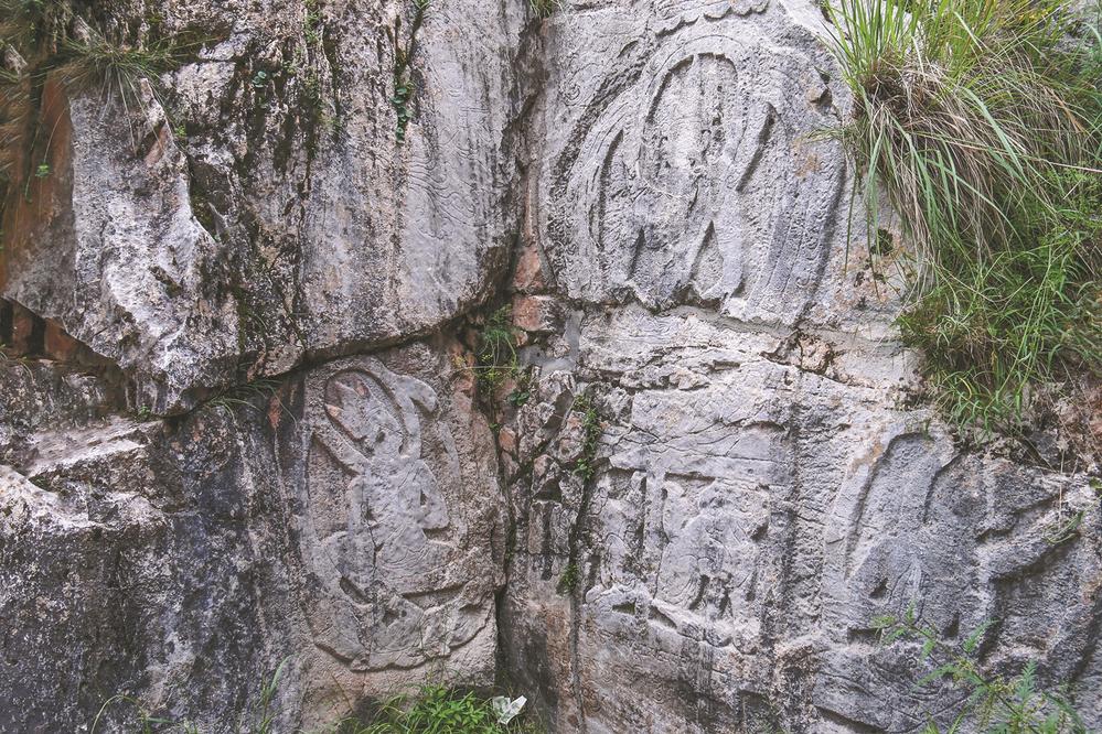 རི་བྱོན་མ་ཎིའི་གཡོན་ཕྱོགས་ཀྱི་བྲག་ངོས་སུ་རྣམ་པར་སྣང་མཛད་ཉིད་པདྨའི་ཁྲི་ལ་རྡོ་རྗེ་སྐྱིལ་ཀྲུང་གི་ཚུལ་དུ་བཞུགས་པའི་སྐུ་དང་། དེའི་འོག་གཡས་གཡོན་གཉིས་ལ་རྡོ་རྗེ་སེམས་དཔའ་དང་སྤྱན་རས་གཟིགས་ཀྱི་སྐུ། དེའི་འོག་ན་གུས་ཕྱག་དང་བཅས་པས་རྟའི་ལོ་བཀྲ་ཤིས་ཉིན་ཞེས་པའི་གནའ་ཡིག་བྲིས་ཡོད་པས། ལེབ་ཁོག་རྡོ་བརྐོས་འདིའི་ལག་ཤེས་དང་དུས་རབས་ནམ་བཞེངས་པ་སོགས་ཀྱི་ཐད་ནས་དཔྱད་ཞིབ་ཀྱི་བདེན་དཔང་བླ་ན་མེད་པ་ཞིག་ཀྱང་འདི་ནས་གསལ་འདུག། ༼ ནོར་བུས་པར་བླངས།༽